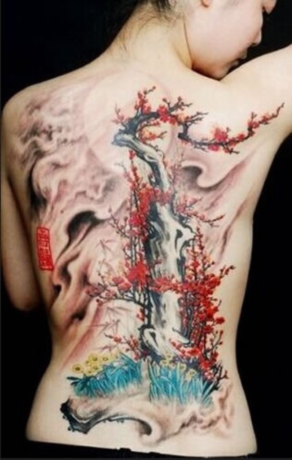 美女后背彩色的红梅图案纹身_后背纹身图案大全_纹身图吧