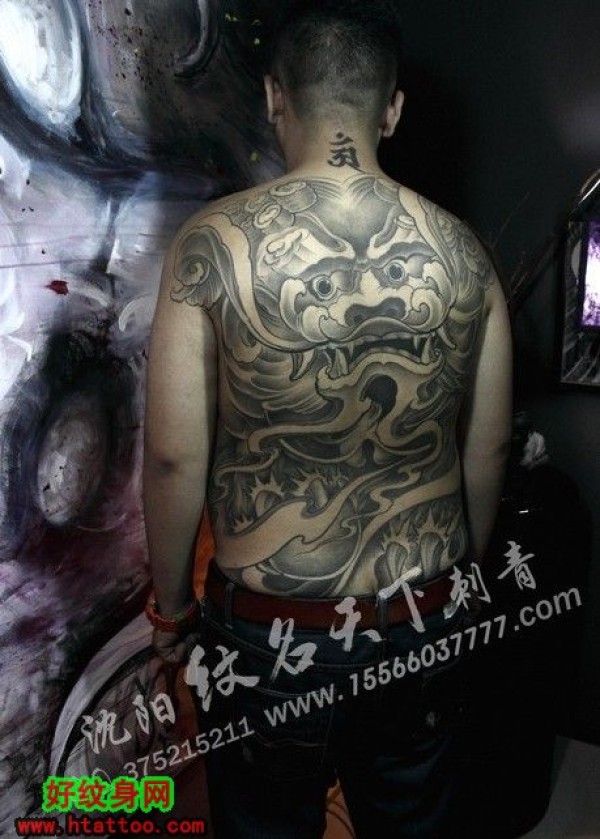 男性满背黑白唐狮子纹身刺青作品传统的中国风_后背纹身图案大全_纹身图吧