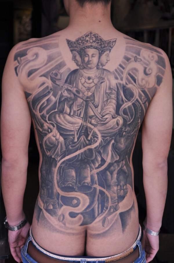 满背四面佛纹身图案艺刺青推荐的素色四面佛纹_后背纹身图案大全_纹身图吧