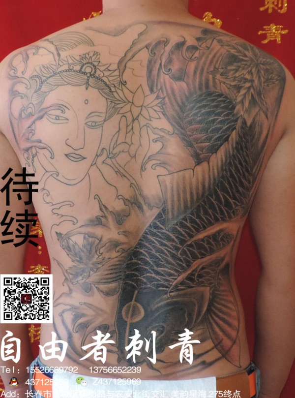 满背佛头加鲤鱼图案组合纹身未完成的佛像加鲤_后背纹身图案大全_纹身图吧