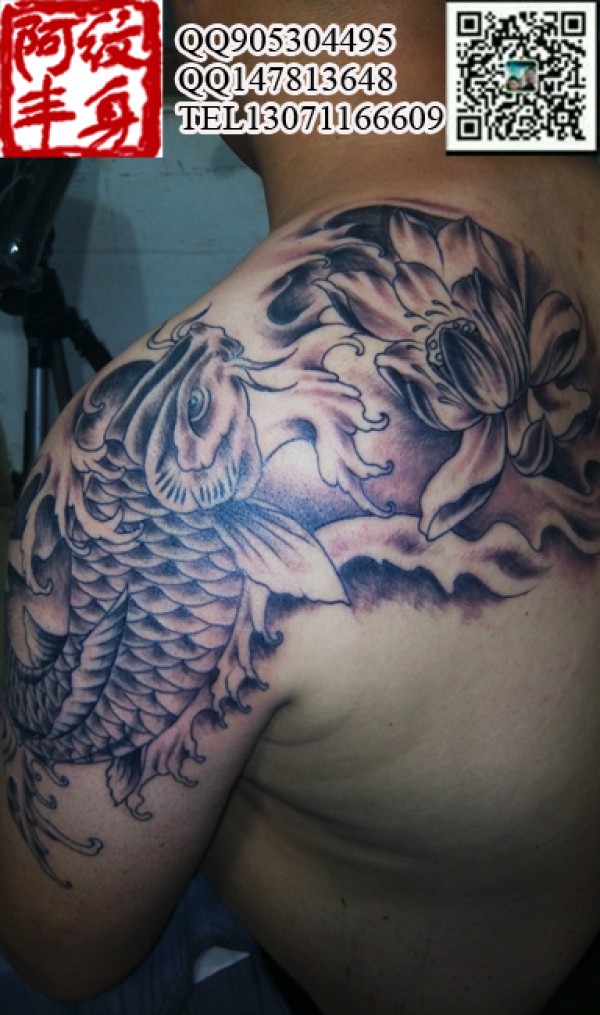 阿丰纹身店最近后背纹身作品欣赏鲤鱼加荷花披_后背纹身图案大全_纹身图吧