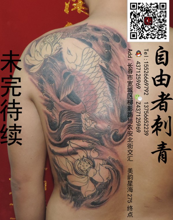 后背未完成的招财鱼纹身图案长春自由者刺青正_后背纹身图案大全_纹身图吧