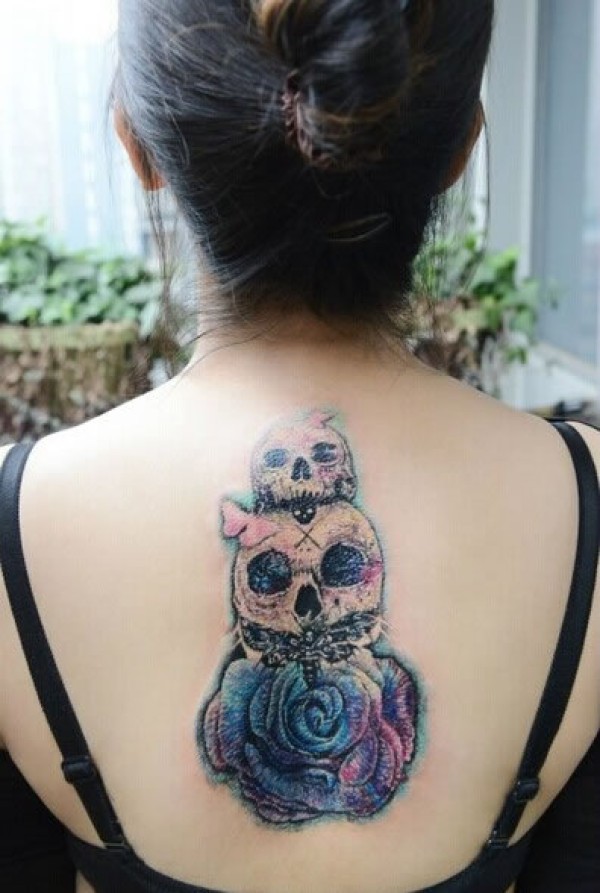 后背上叠加的骷髅头图案彩色纹身叠加在花朵之_后背纹身图案大全_纹身图吧