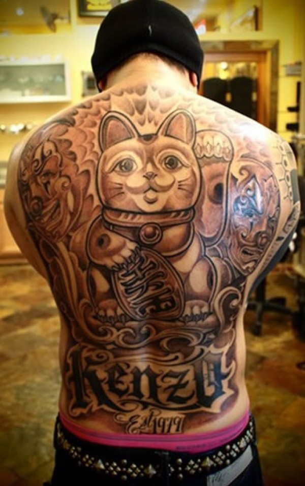 寓意着财源广进的招财猫纹身图后背上迷雾感的_后背纹身图案大全_纹身图吧