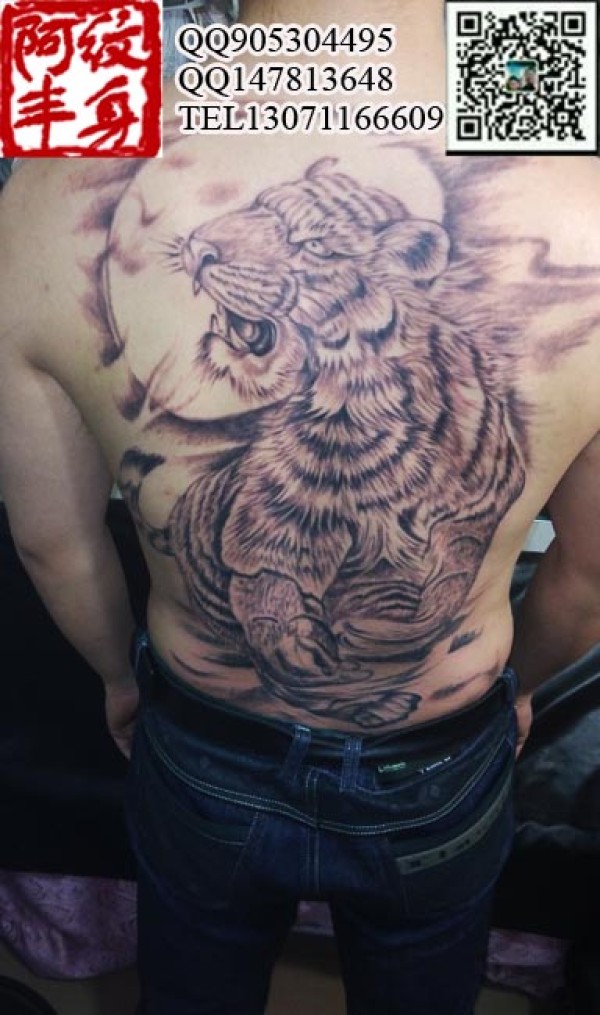 后背上凶猛的老虎图案刺青落日余光下的老虎图_后背纹身图案大全_纹身图吧