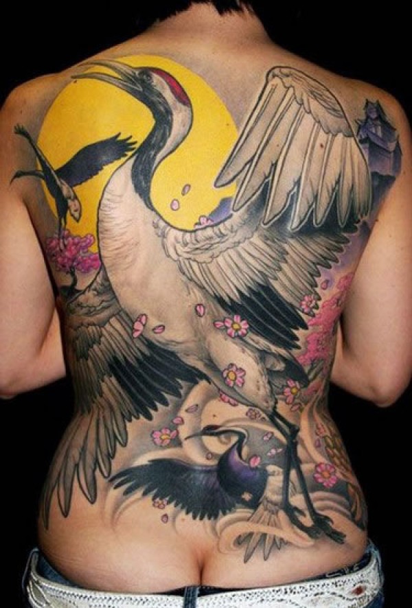 唯美的纹身图案,后背灵动的仙鹤纹身夕阳下的_后背纹身图案大全_纹身图吧