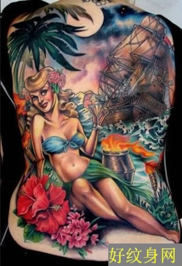 后背彩色的海盗系列美女图案纹身海盗系列比基_后背纹身图案大全_纹身图吧