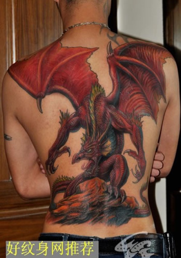 后背上盛气凌人的大型怪兽纹身图案后背上红色_后背纹身图案大全_纹身图吧