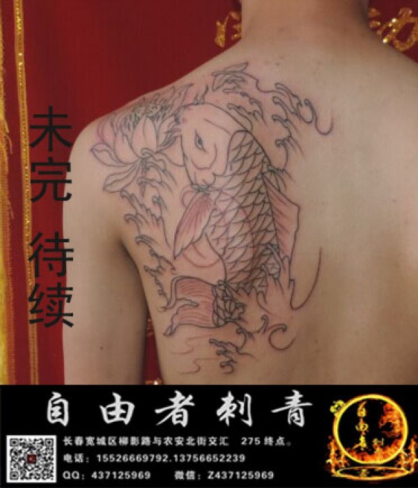 后背招财鱼未完作品展示侧背粗实线条招财鱼纹_后背纹身图案大全_纹身图吧