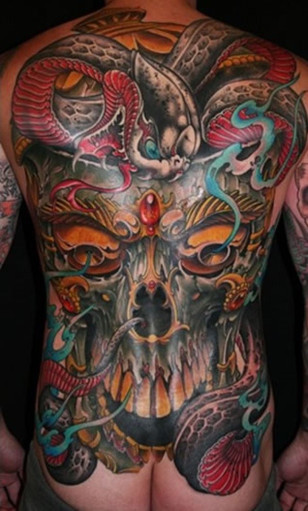 鬼脸纹身,满背恐怖的鬼脸图案彩色纹身恐怖的_后背纹身图案大全_纹身图吧