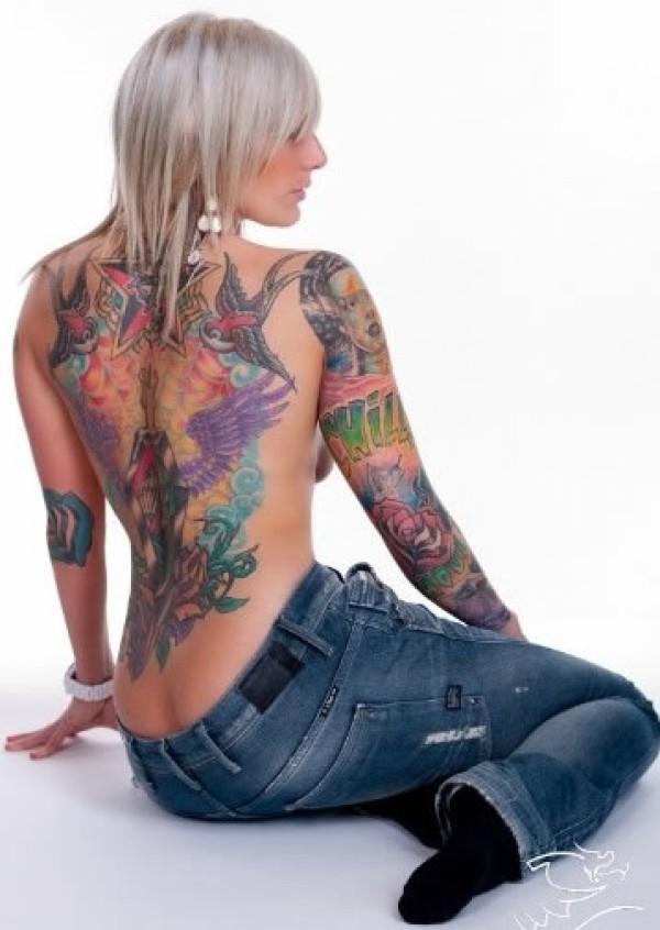 美女后背上飞翔的彩绘燕子纹身图片欧美女士的_后背纹身图案大全_纹身图吧