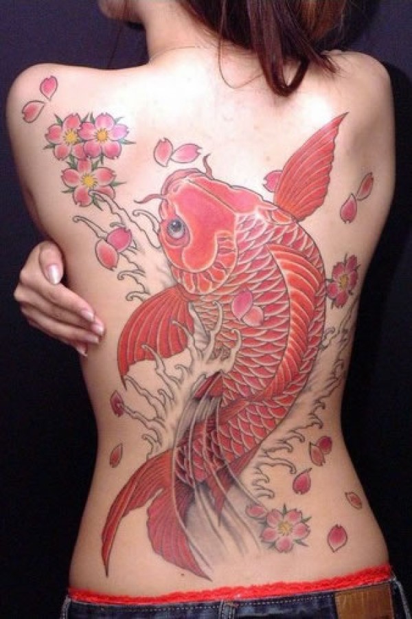 后背彩色纹身,艳丽的鲤鱼加荷花纹身图案美女_后背纹身图案大全_纹身图吧
