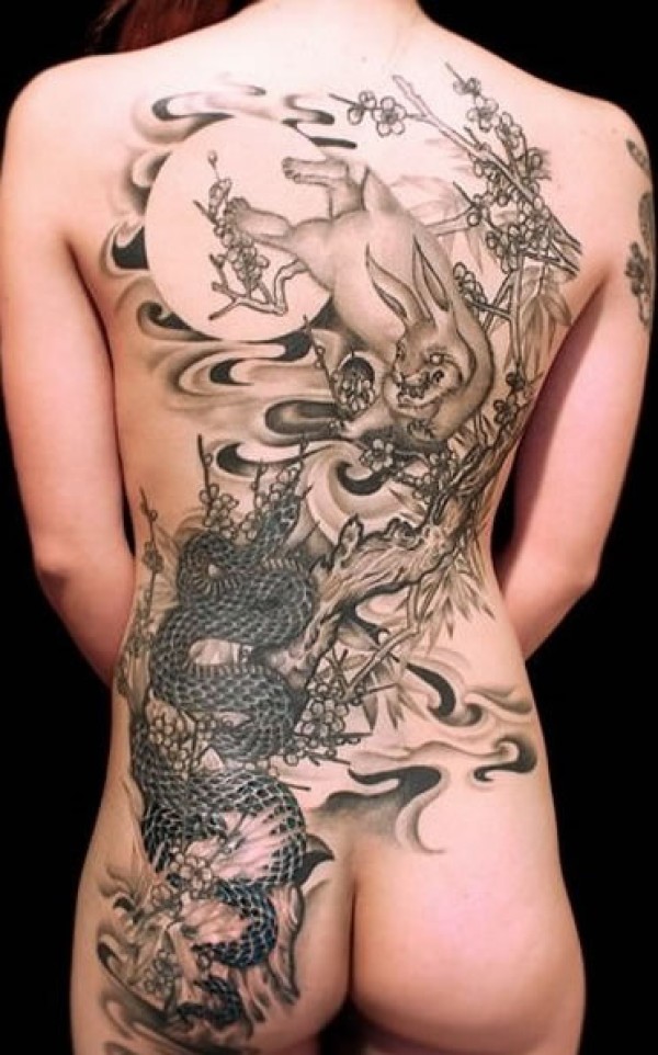 满背神龙与狡兔组合图案纹身满背流云衬托龙与_后背纹身图案大全_纹身图吧