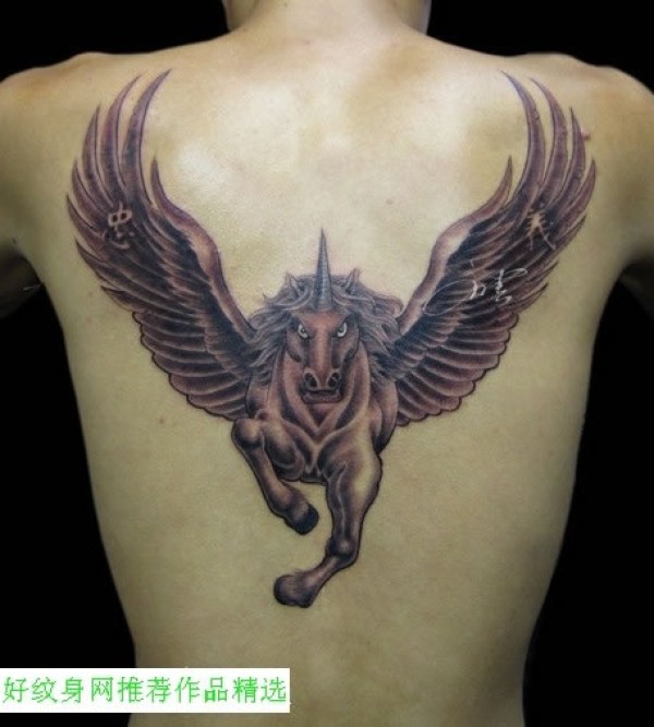 展翅翱翔的独角兽纹身图案这款后背独角兽纹身_后背纹身图案大全_纹身图吧