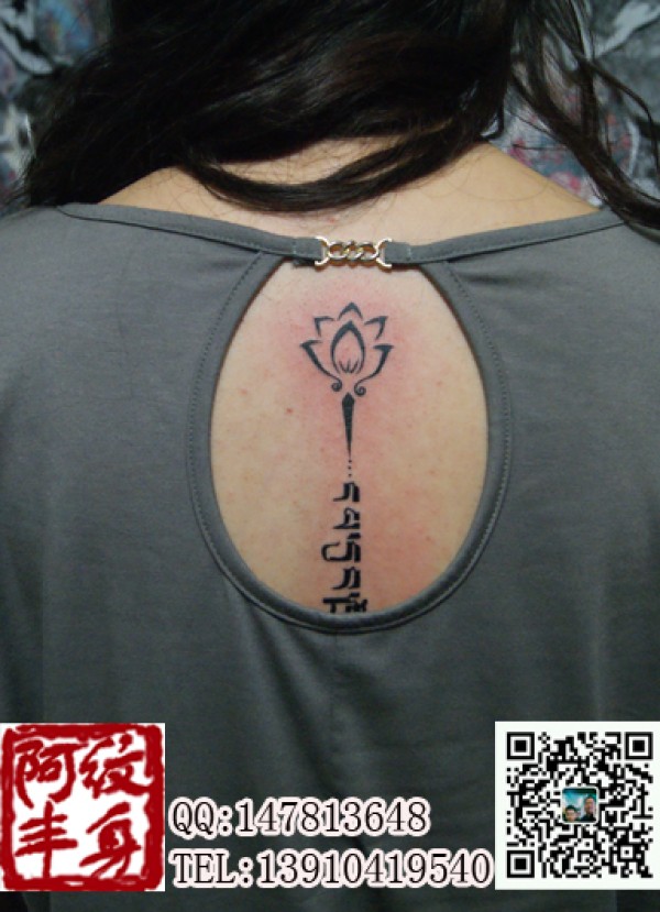 女士后背的荷花纹身图案荷花图腾加字体纹身,_后背纹身图案大全_纹身图吧