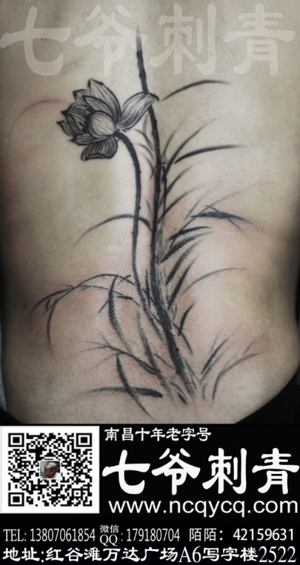 背部传统水墨风格花朵纹身图案素色荷花纹身图_后背纹身图案大全_纹身图吧