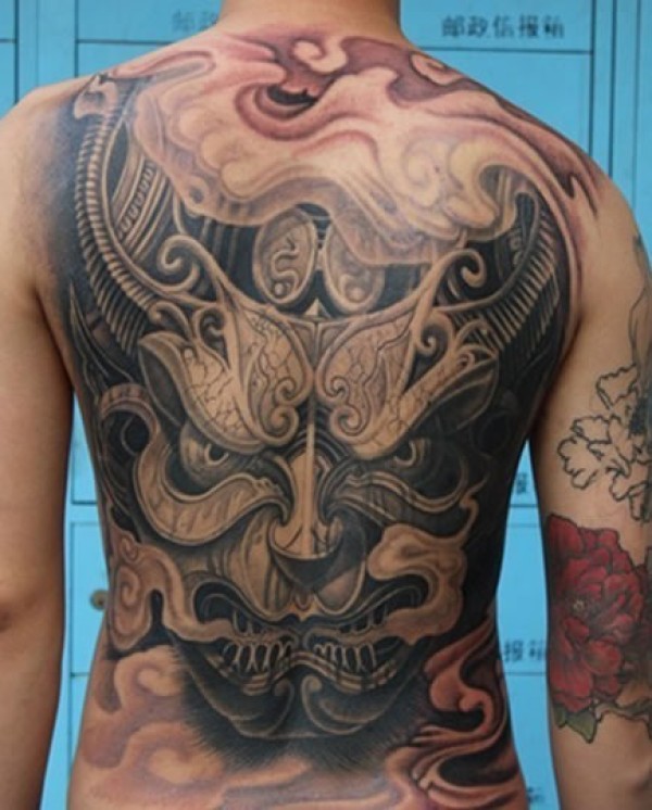 超酷的后背神魔面具图案纹身满背带流云的钢铁_后背纹身图案大全_纹身图吧