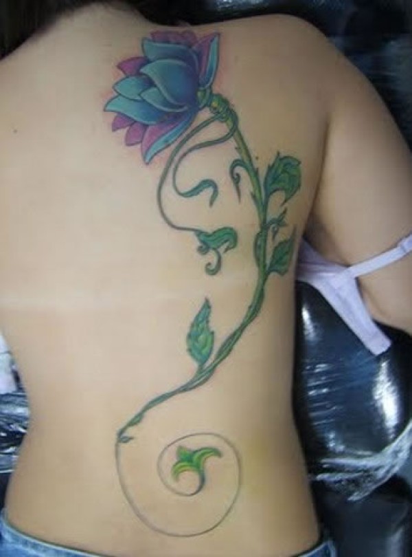 女生秀丽后背上的鲜花藤蔓纹身图彩色荷花藤蔓_后背纹身图案大全_纹身图吧