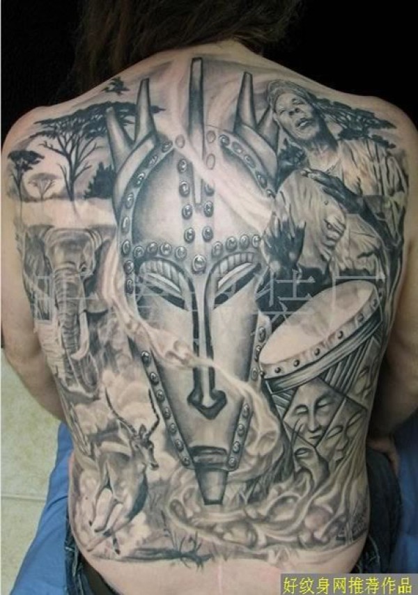 满背非洲面具纹身与面具图腾非洲元素的面具图_后背纹身图案大全_纹身图吧