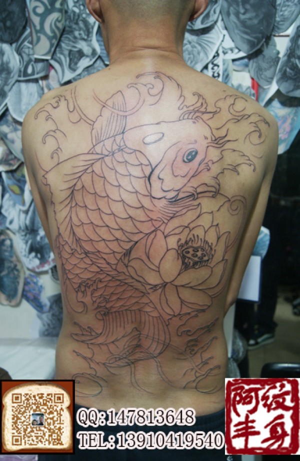 后背带荷花的一尾大鲤鱼纹身图后背大条的线条_后背纹身图案大全_纹身图吧