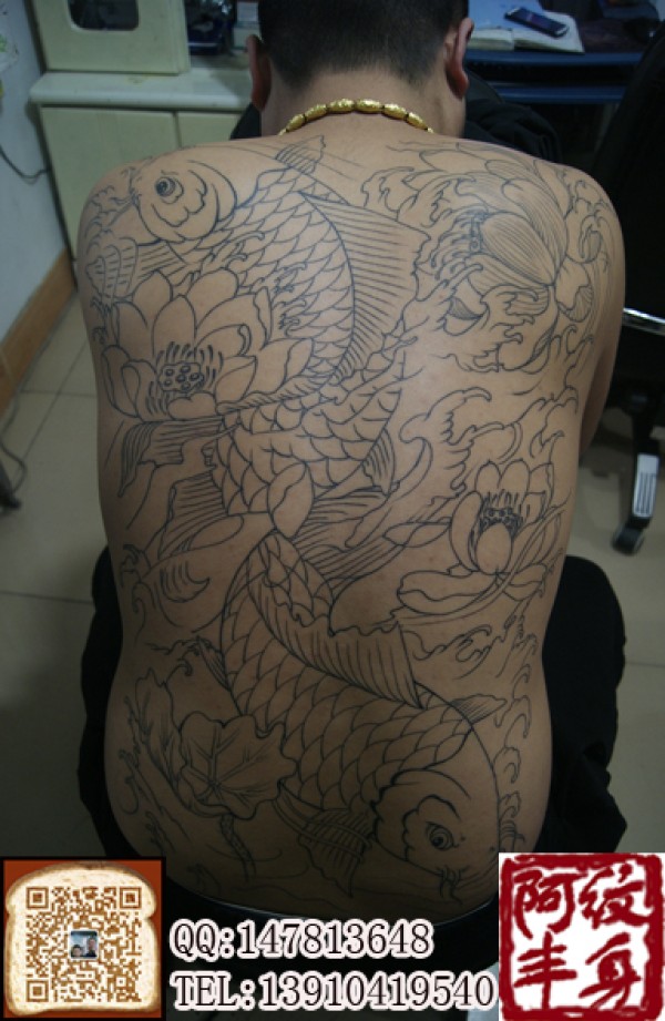 满后背线条带花游鱼纹身图案虽然是简笔画的线_后背纹身图案大全_纹身图吧
