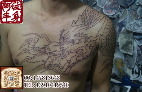 后背环绕至前胸的线条龙纹身线条龙纹身的尾部_后背纹身图案大全_纹身图吧