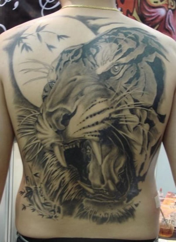 后背威风凛凛的咆哮虎头纹身图满后背素色咆哮_后背纹身图案大全_纹身图吧