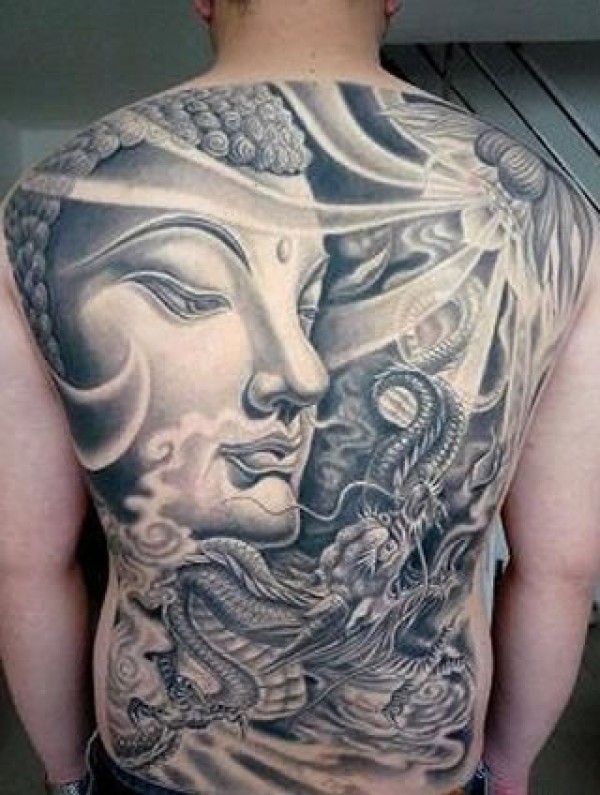 素色慈祥的佛像图案纹身带龙的佛像纹身图案_后背纹身图案大全_纹身图吧