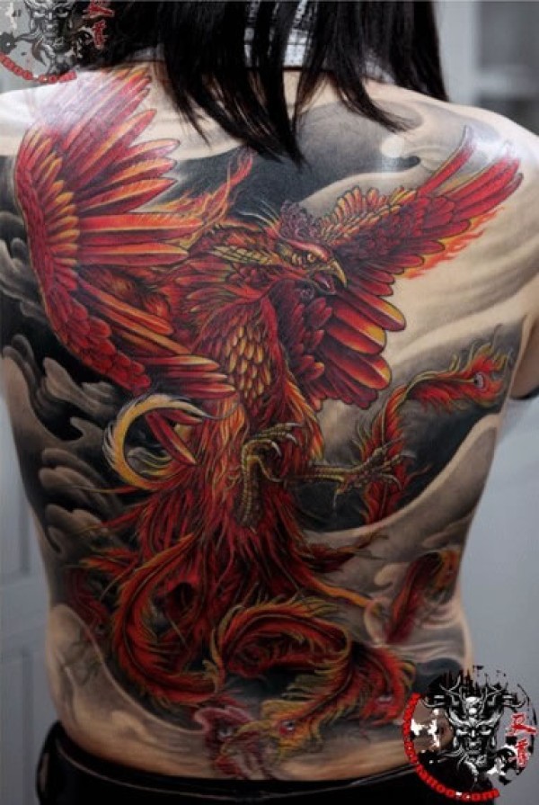 后背红色主题神鸟朱雀纹身图案暗底红色朱雀纹_后背纹身图案大全_纹身图吧