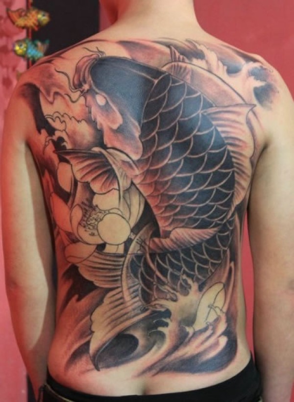 后背素色跳跃的鲤鱼图案纹身图嫣红流云打底的_后背纹身图案大全_纹身图吧