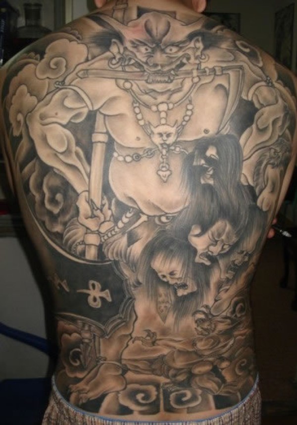 满后背素色地狱小鬼纹身图案手拿各种凶器的恶_后背纹身图案大全_纹身图吧