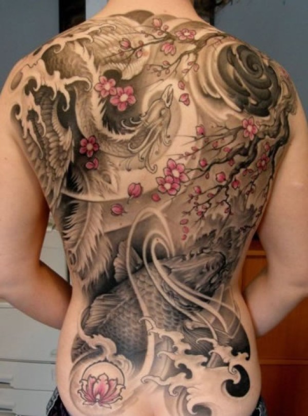 后背不同色彩的带花鲤鱼纹身图案满后背素色鲤_后背纹身图案大全_纹身图吧