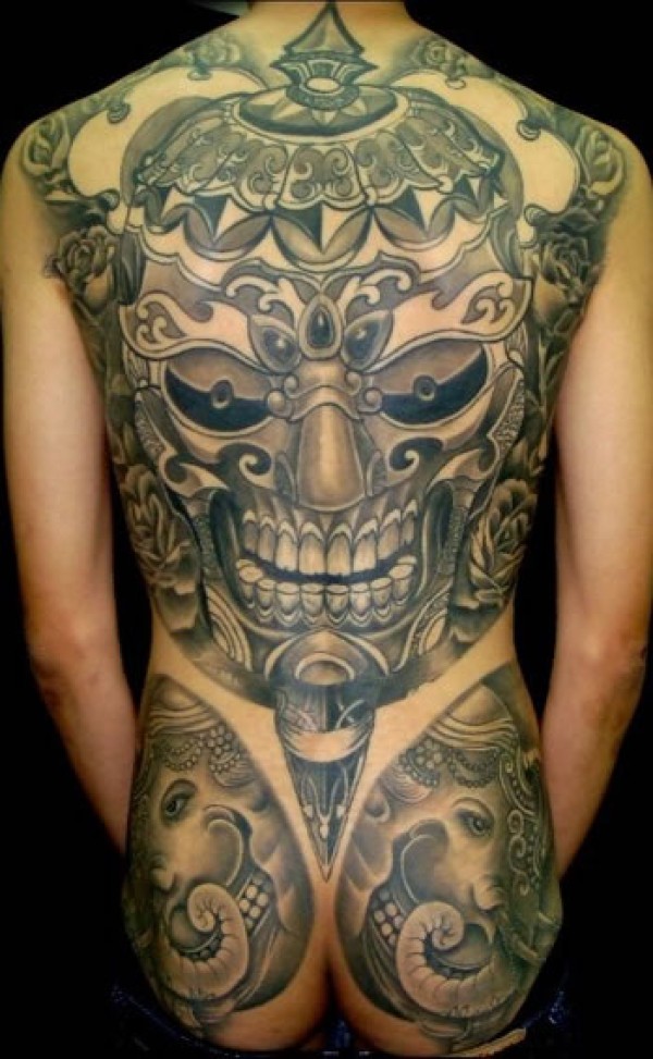 不同形态与颜色的满后背包臀骷髅头纹身非常完_后背纹身图案大全_纹身图吧