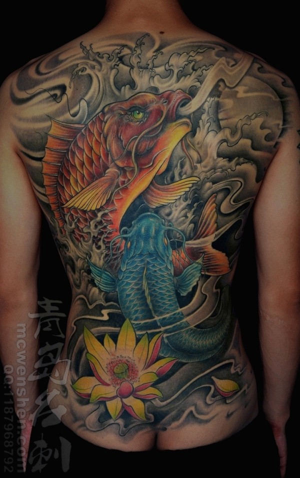 浅灰色流云打底的彩绘鱼纹身图浅色底带花鱼纹_后背纹身图案大全_纹身图吧