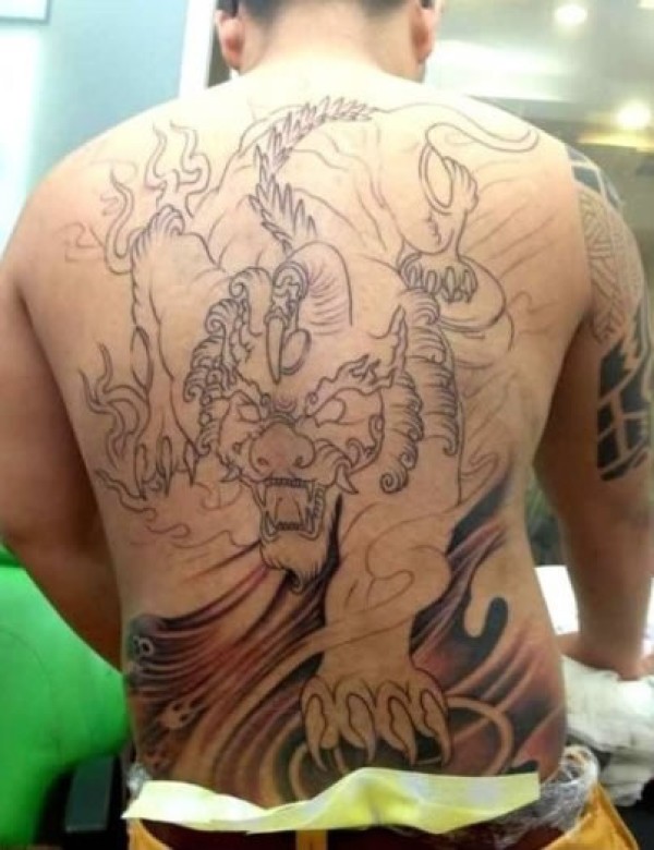 后背神兽纹身勾勒至完工过程图先用简单的线条_后背纹身图案大全_纹身图吧