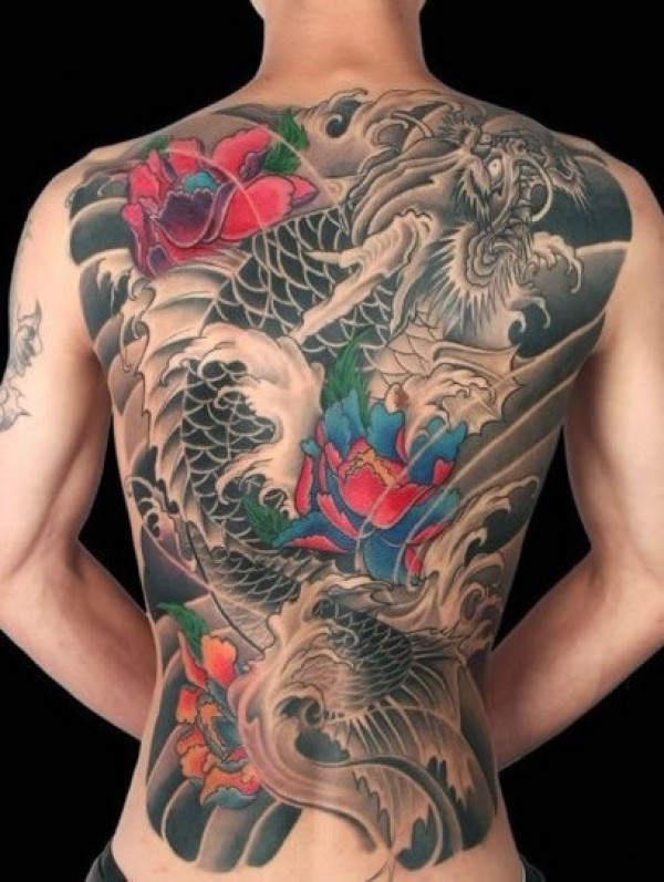 后背覆盖大体型鲤鱼纹身图满后背素色鲤鱼带花_后背纹身图案大全_纹身图吧