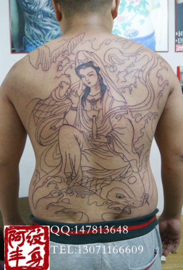 丰台纹身作品,后背线条佛像图案坐在鱼背上的_后背纹身图案大全_纹身图吧