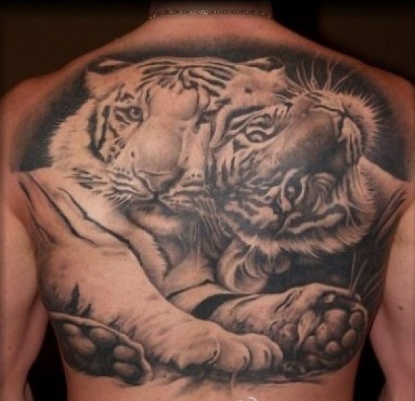 后背嬉戏的老虎图案纹身纹身一改百兽之王昔日_后背纹身图案大全_纹身图吧