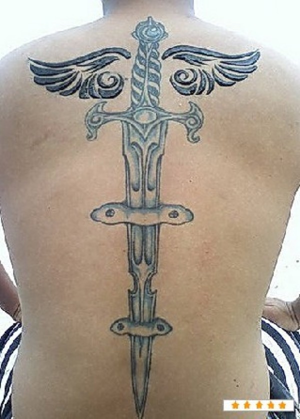 后背宝剑图案纹身宝剑纹身的手柄处有些倾斜,_后背纹身图案大全_纹身图吧