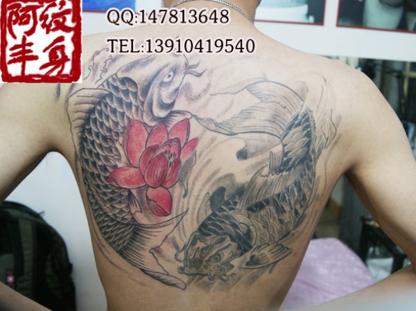 后背双鱼纹身作品这款双鱼与荷花纹身图看起来_后背纹身图案大全_纹身图吧