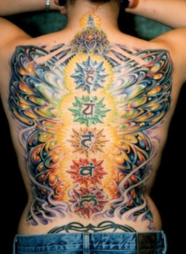炫丽的色彩纹身,这图案跟佛教有点关系吧_后背纹身图案大全_纹身图吧