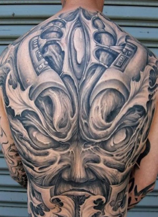 机械脸谱纹身,不仔细看都看不出脸谱的存在的_后背纹身图案大全_纹身图吧