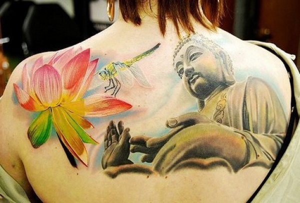 女生后背的佛像纹身,还有荷花与蜻蜓的点缀_后背纹身图案大全_纹身图吧