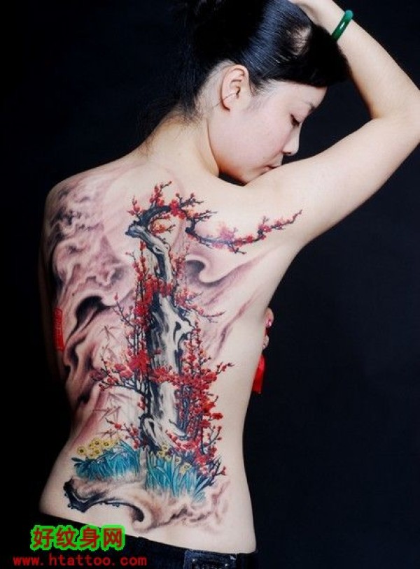 一个女孩后背漂亮的梅花风景纹身_后背纹身图案大全_纹身图吧