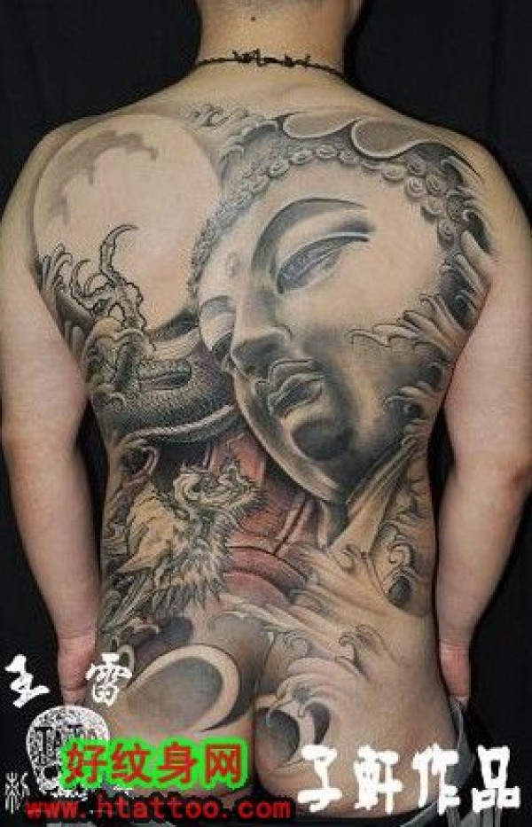 背部大日如来黑白纹身,佛教主题中的精髓_后背纹身图案大全_纹身图吧