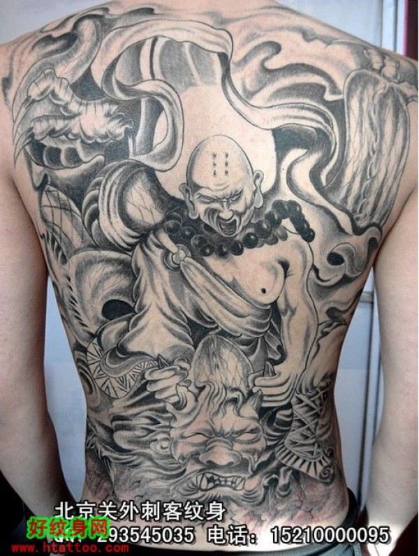 背部大黑白降龙罗汉纹身图案_后背纹身图案大全_纹身图吧
