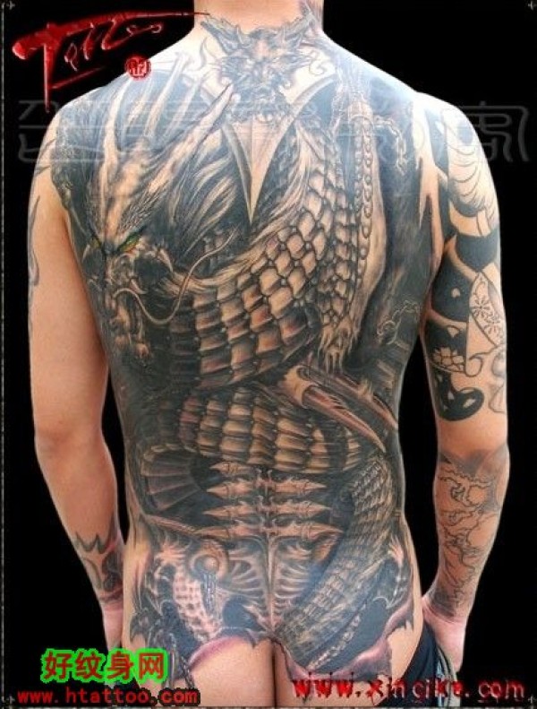 满背黑白大图纹身作品之囚龙_后背纹身图案大全_纹身图吧