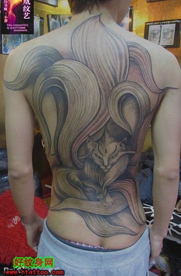 特别设计制作的满背黑白九尾妖狐纹身_后背纹身图案大全_纹身图吧