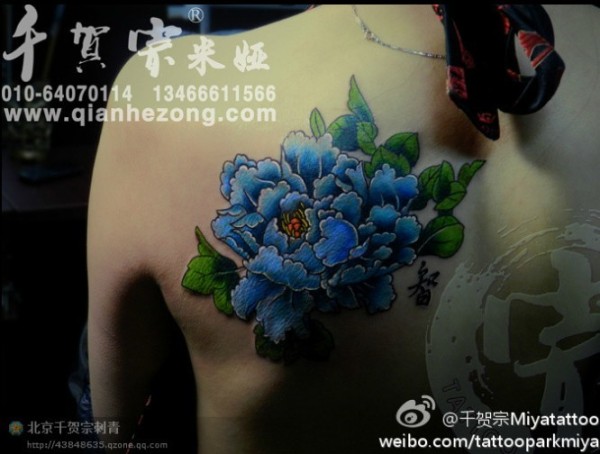 美女背上的蓝色牡丹千贺宗纹身出品_后背纹身图案大全_纹身图吧