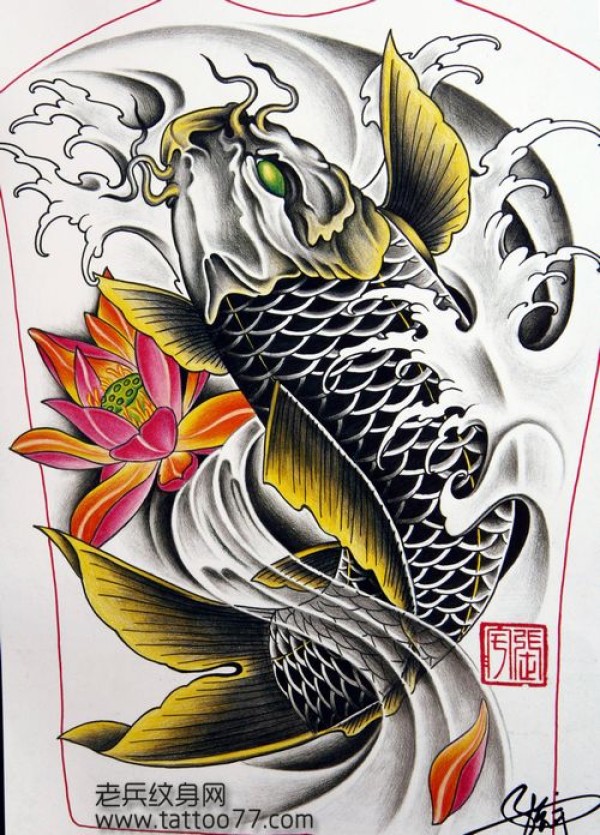 满背鲤鱼莲花纹身手稿_后背纹身图案大全_纹身图吧